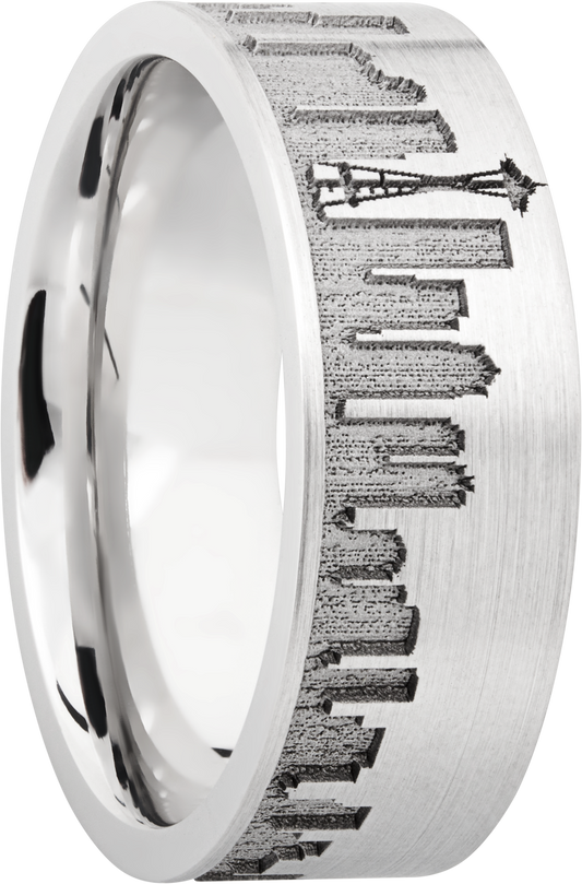 Cobalt chrome 8mm flat band with laser-carved Seattle skyline