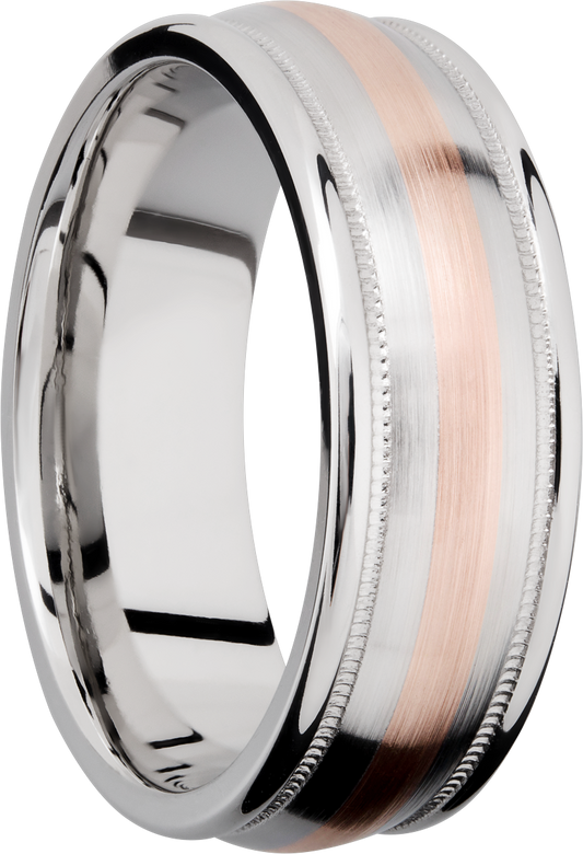 Cobalt chrome 8mm domed band with rounded edges and 14K rose gold inlays in reverse milgrain