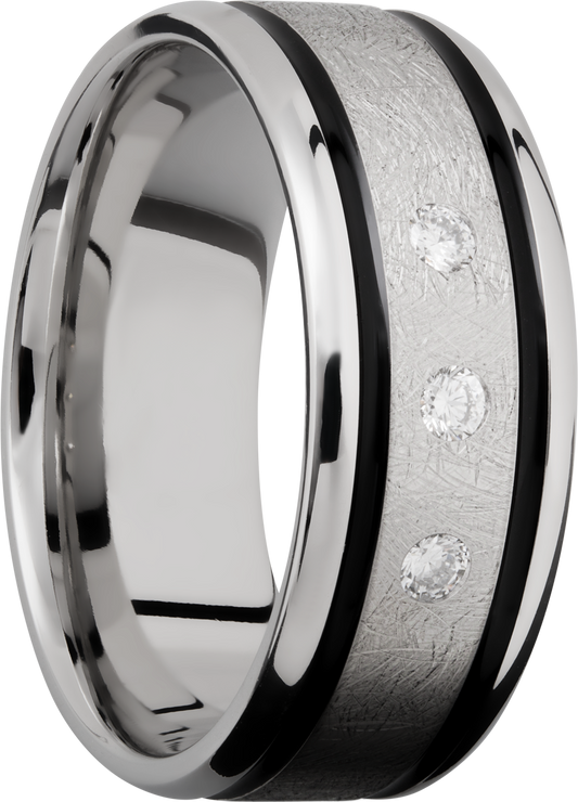 Cobalt chrome 9mm beveled band with black Cerakote in grooves and 3, .05ct flush-set diamonds