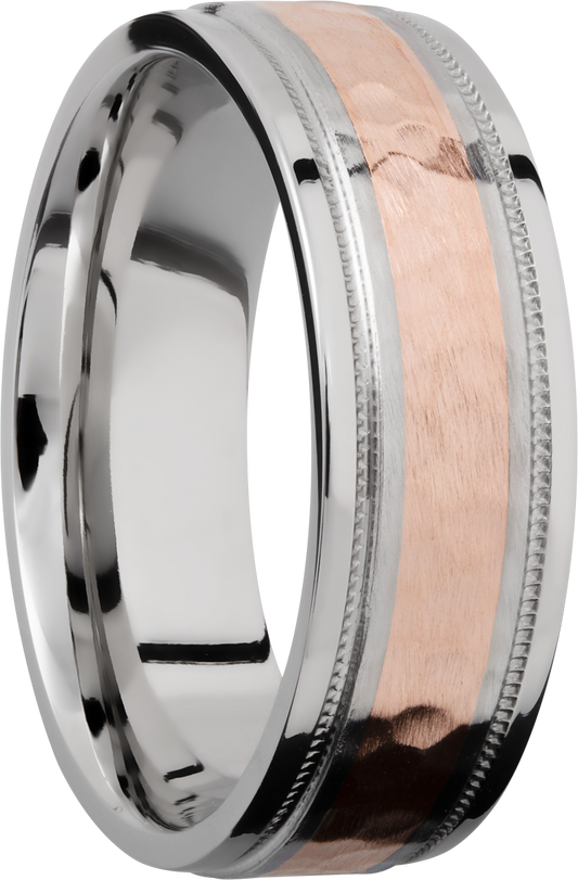 Cobalt chrome 7.5mm flat band with grooved edges and reverse milgrain detail and inlay of 14K rose gold