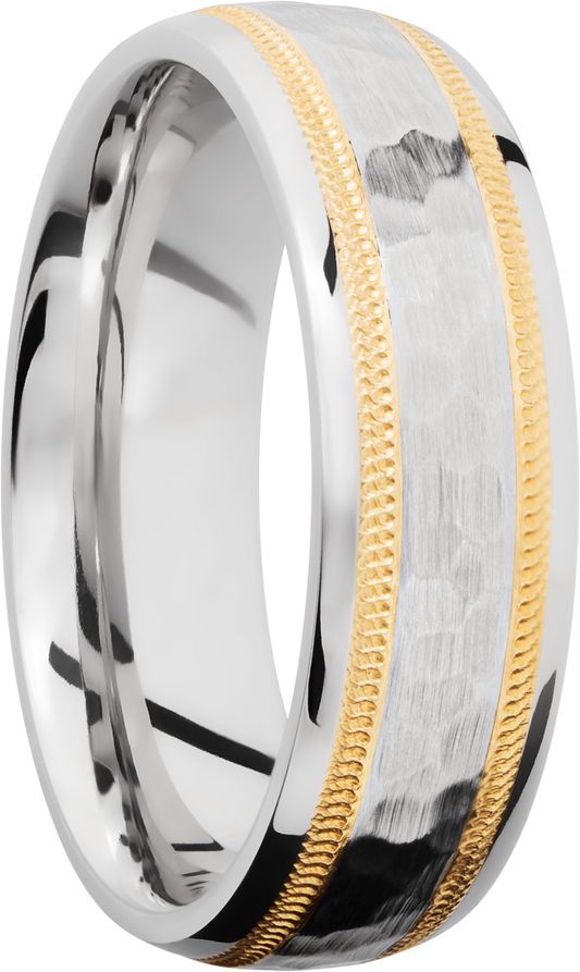 Cobalt chrome 7mm domed band with an two inlays of 14K yellow gold in milgrain