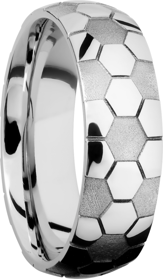 Cobalt chrome 7mm domed band with laser-carved soccer ball pattern