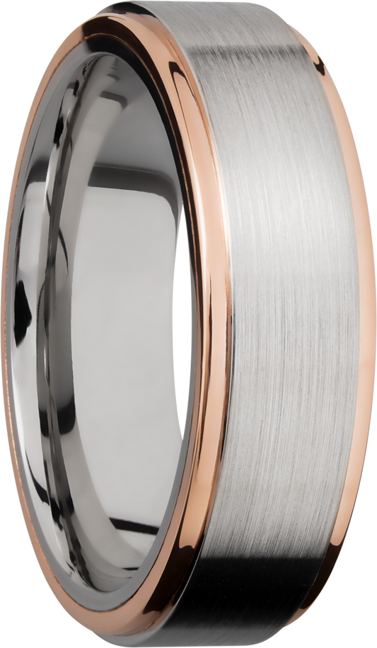 Cobalt chrome 7mm flat band with grooved edges and 14K rose gold edges