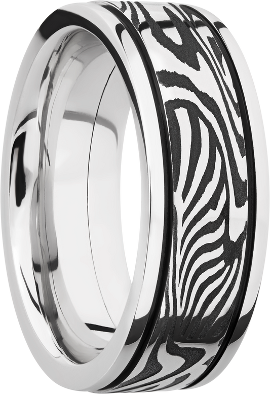 Cobalt chrome 8mm flat band with an inlay of handmade sunset Damascus steel accented with MGA on either side