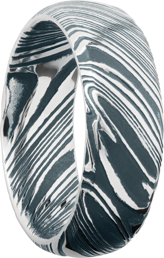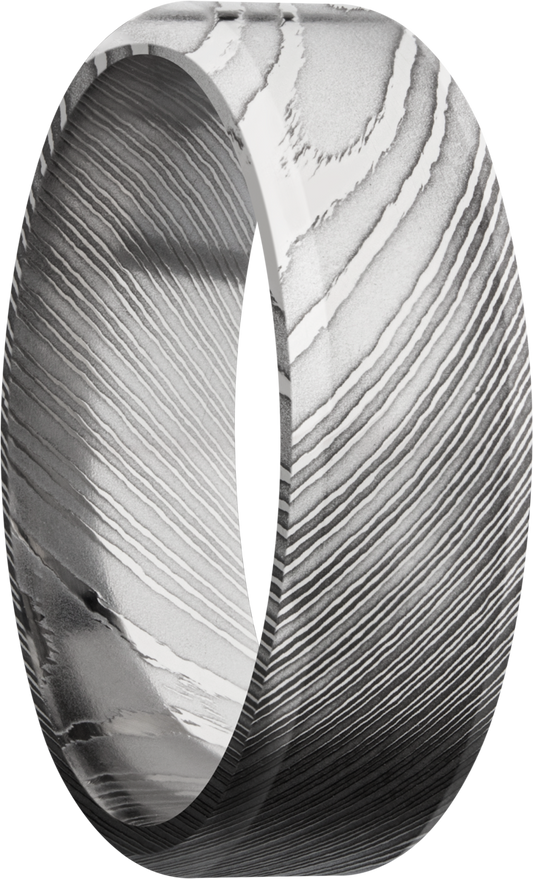 Woodgrain Damascus steel 8mm domed band beveled edges and Black Cerakote in the recessed pattern