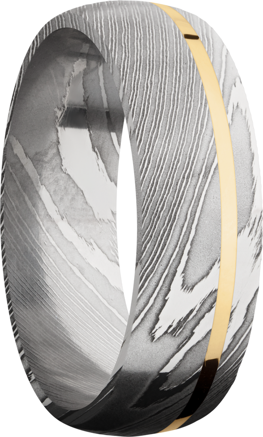 Handmade 7mm Damascus steel band with an off center inlay of 14K yellow gold