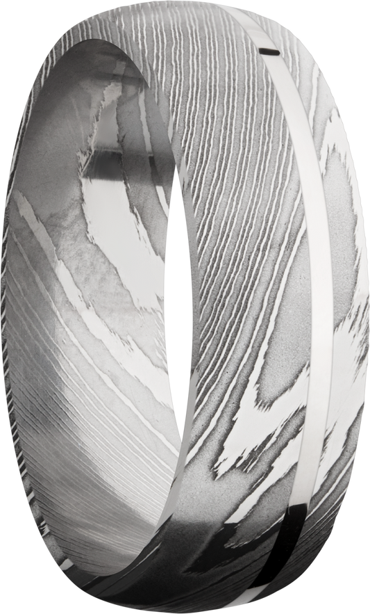 Handmade 7mm Damascus steel band with an off center inlay of sterling silver
