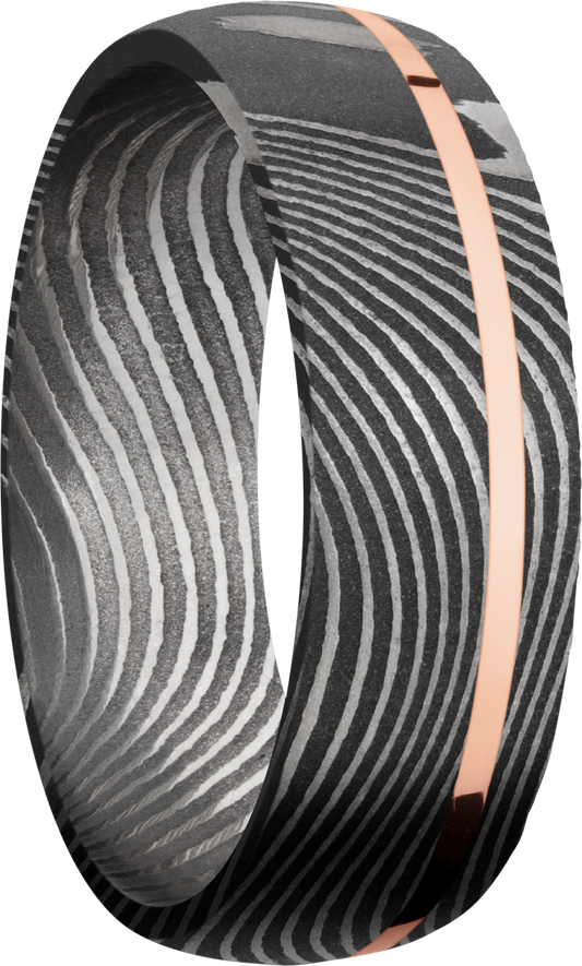 Handmade 7mm Damascus steel band with an off center inlay of 14K rose gold