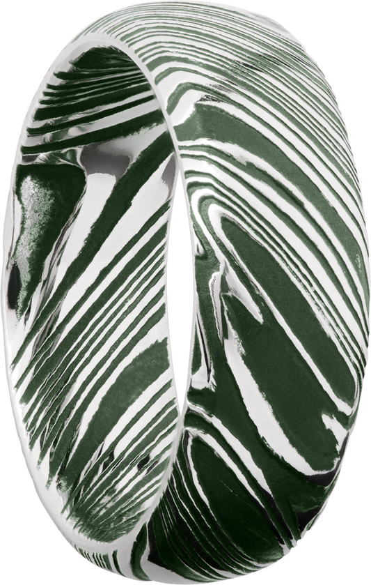 Woodgrain Damascus steel 8mm domed band beveled edges and Eastern Green Cerakote in the recessed pattern