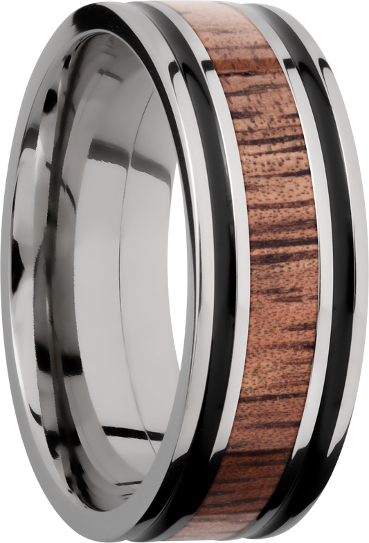 Titanium 8mm flat band with antiquing on both sides of an Koa hardwood inlay