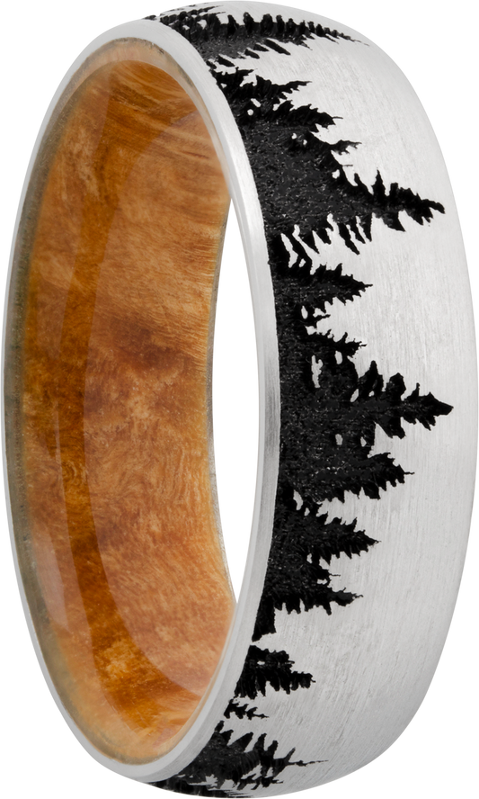 Cobalt chrome 7mm domed band featuring a laser-engraved tree pattern and a hardwood sleeve of Boxelder Burl