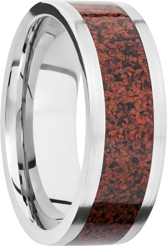 Titanium 8mm flat band with a mosaic inlay of red dinosaur bone