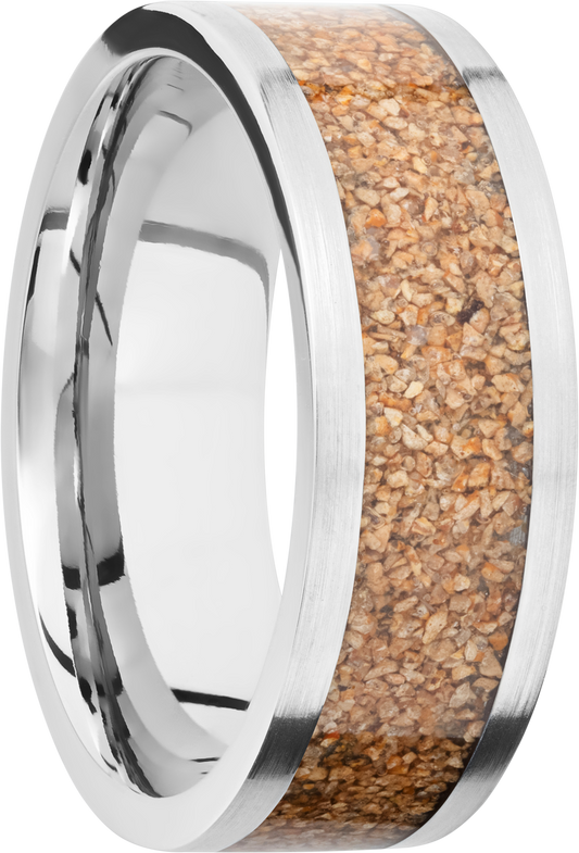 Titanium 8mm flat band with a mosaic inlay of tan dinosaur bone