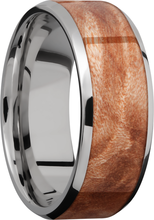 Titanium 8mm beveled band with an inlay of Mapleburl hardwood