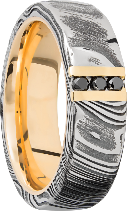 Handmade 7mm zebra Damascus steel band with a vertical inlay of 14K yellow gold and bezel-set black diamond