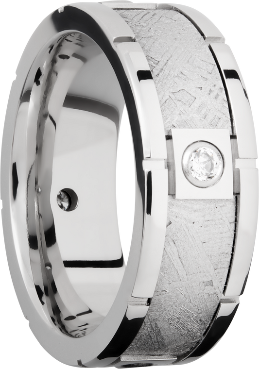 Cobalt chrome 8mm beveled band with four segments bezel-set with .07ct white diamonds in an inlay of authentic Gibeon Meteorite