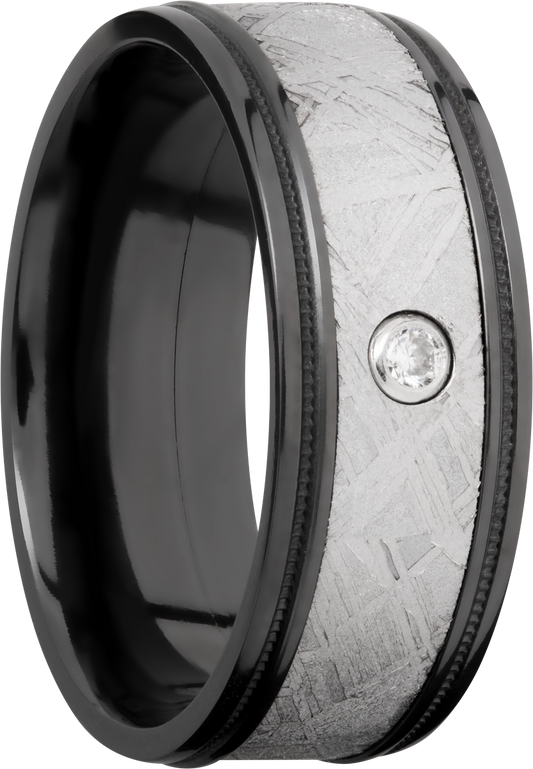 Zirconium 8.5mm flat band with reverse milgrain around an inlay of authentic Gibeon meteorite and white diamond accent