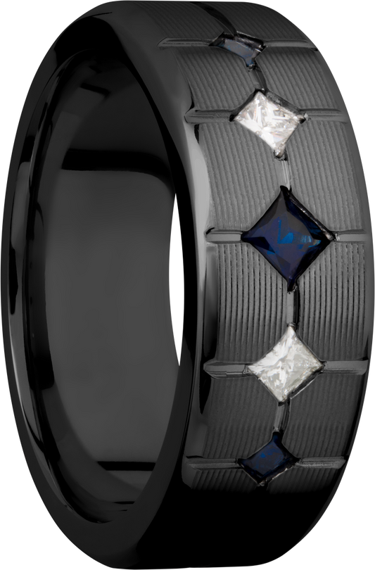 Zirconium 8mm beveled band with 3 sapphires and 2 diamonds