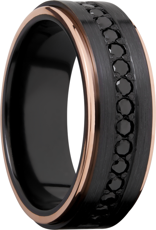Regular price $2,079.00Regular priceUnit price / perSale price $2,079.00Zirconium 8mm flat band with 14K rose gold grooved edges and 16, .04ct bead-set eternity black diamonds -