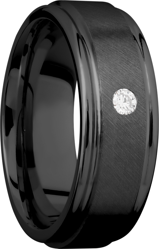 Zirconium 8mm flat band with slightly rounded edges and a flush-set .07ct diamond
