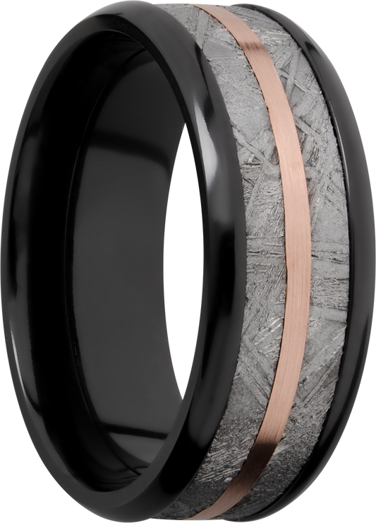 Zirconium 8mm beveled band with an inlay of authentic Gibeon Meteorite and a 14K rose gold inlay