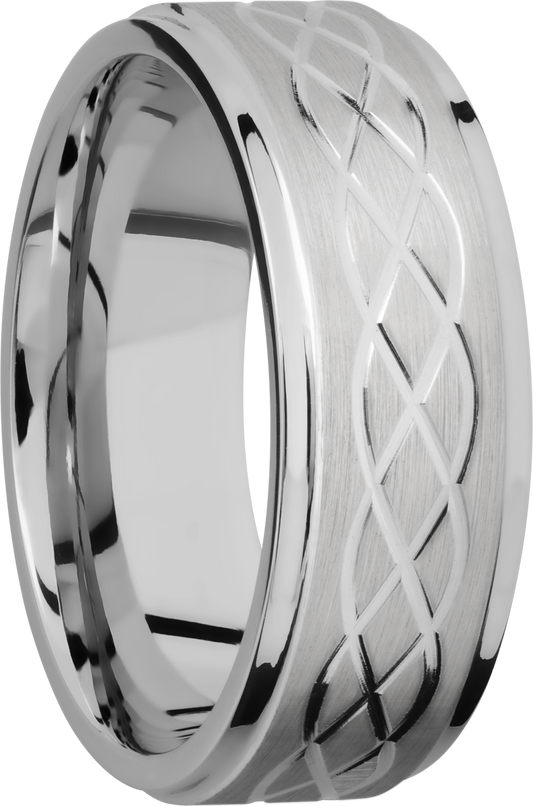 Titanium 8mm flat band with grooved edges and a laser-carved celtic pattern