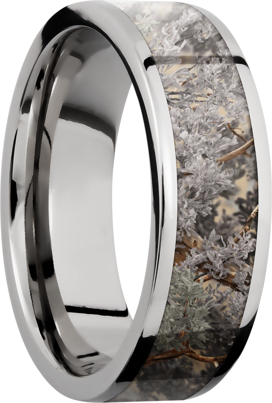 Cobalt chrome 7mm flat band with a 5mm inlay of Kings Desert Camo