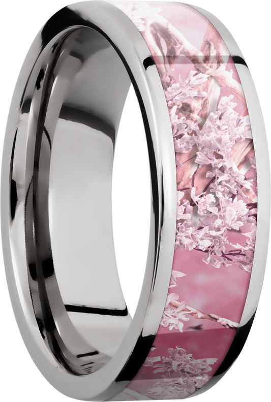 Cobalt chrome 7mm flat band with a 5mm inlay of Kings Pink Camo