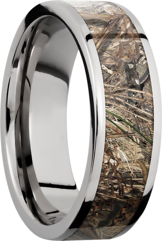 Cobalt chrome 7mm flat band with a 5mm inlay of Mossy Oak Duck Blind Camo