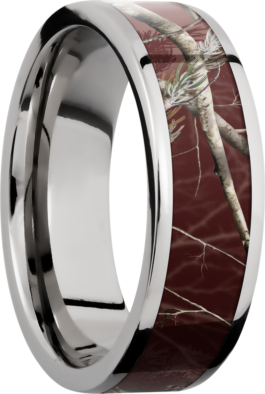 Cobalt chrome 7mm flat band with a 5mm inlay of Realtree APC Maroon Camo