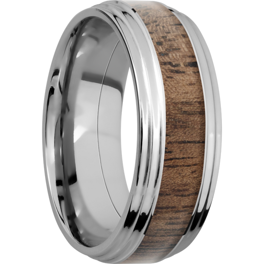 Cobalt chrome 8mm domed band with 2, .5mm grooves and a sleeve of Whiskey Barrel hardwood