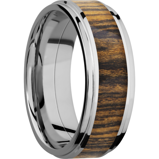 Cobalt chrome 8mm flat band with grooved edges and an inlay of Bocote hardwood