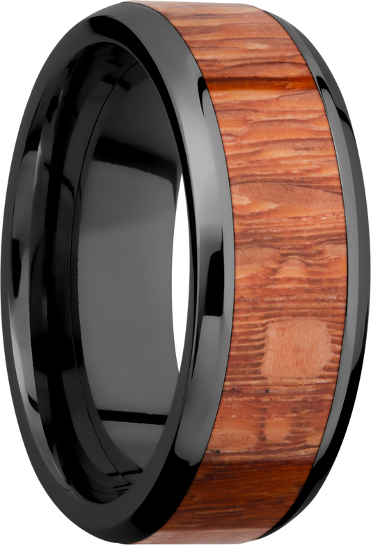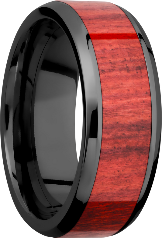 Zirconium 8mm beveled band with an inlay of Honduras Redheart hardwood