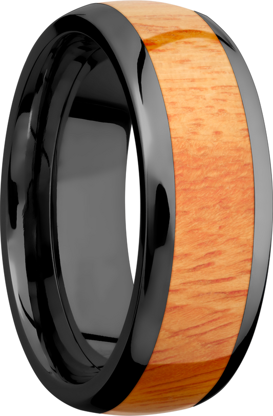 Zirconium 8mm domed band with an inlay of Osage Orange hardwood