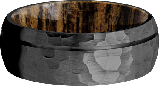 Zirconium 8mm domed band with 1, .5mm groove and a sleeve of Bocote hardwood