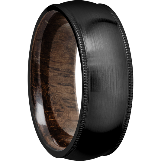 Zirconium 8mm domed band with milgrain edges and a sleeve of Walnut hardwood