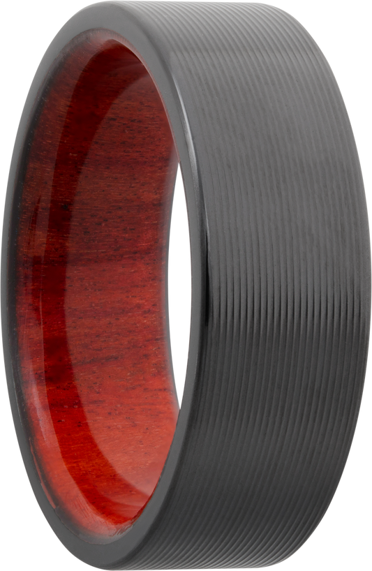 Zirconium 8mm flat band with rounded edges and a hardwood sleeve of Honduras Redheart