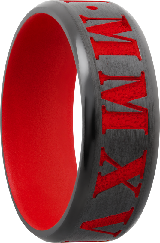 Zirconium 8mm beveled band with laser-carved roman numerals featuring red Cerakote in the recessed pattern and on the sleeve
