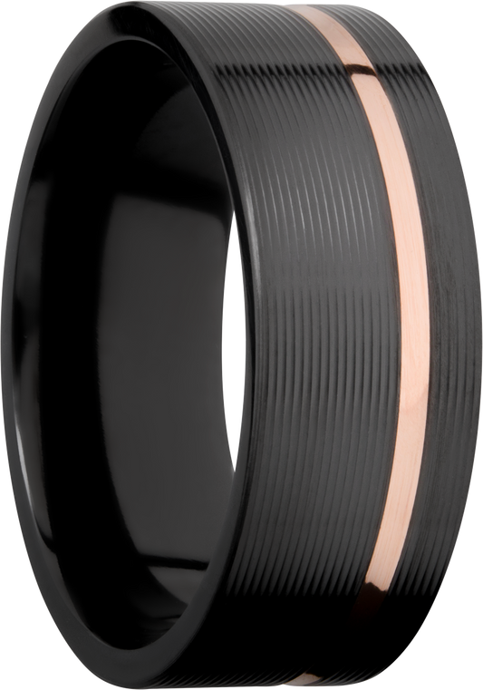 Zirconium 8mm flat band with an off center inlay of 14K rose gold