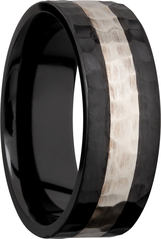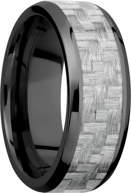 Zirconium 8mm beveled band with a 5mm inlay of silver Carbon Fiber