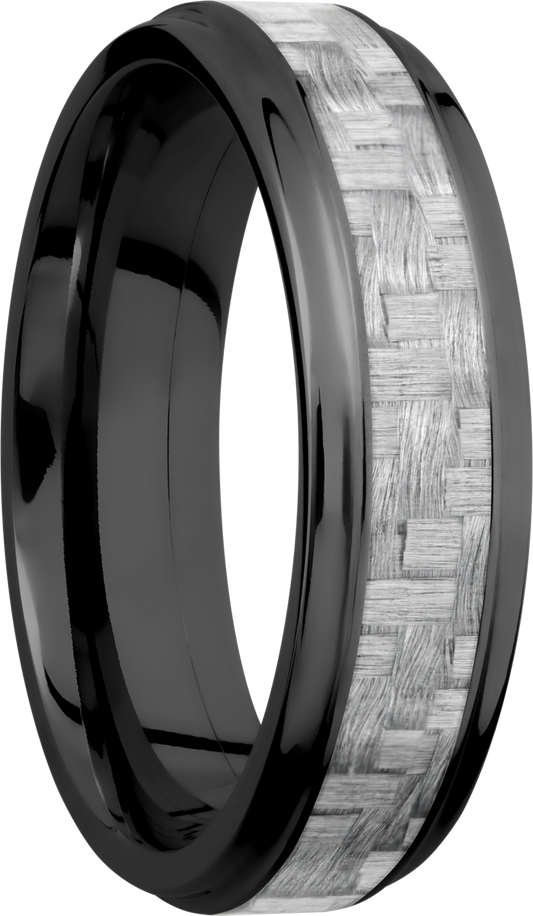 Zirconium 6mm flat band with grooved edges and a 3mm inlay of silver Carbon Fiber