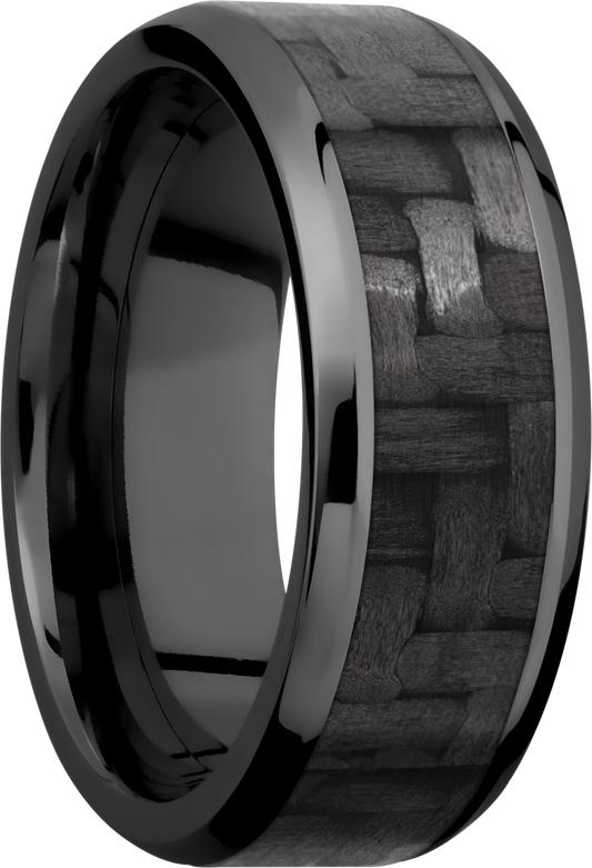 Zirconium 8mm beveled band with a 5mm inlay of black Carbon Fiber