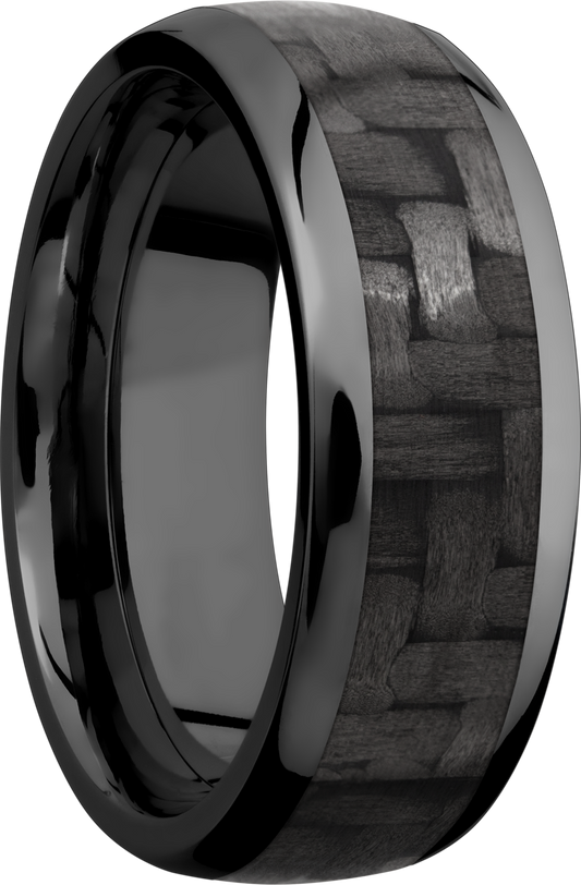 Zirconium 8mm domed band with a 5mm inlay of black Carbon Fiber