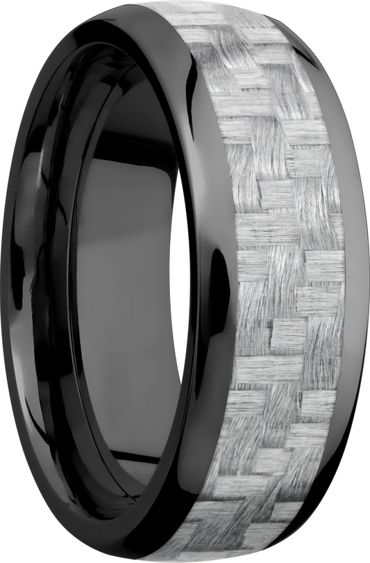Zirconium 8mm domed band with a 5mm inlay of silver Carbon Fiber