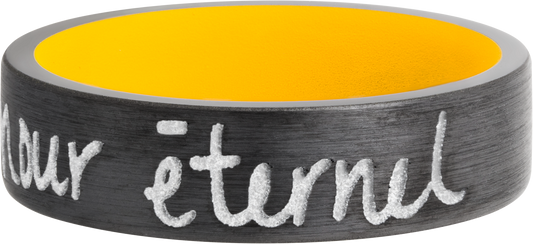 Zirconium 7mm flat band with slightly rounded edges and a laser-carved handwritten message with a yellow Cerakote sleeve