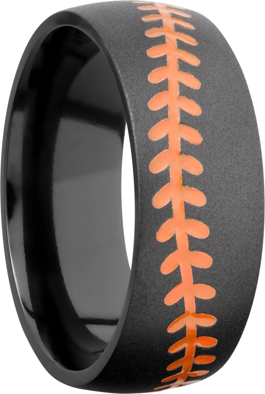 Zirconium 8mm domed band with a laser-carved baseball stitch and orange Cerakote in the recessed stitching