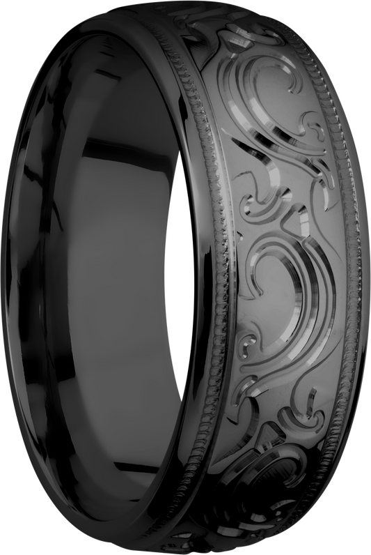 Zirconium 8mm domed band with a laser-carved scroll MJBA pattern