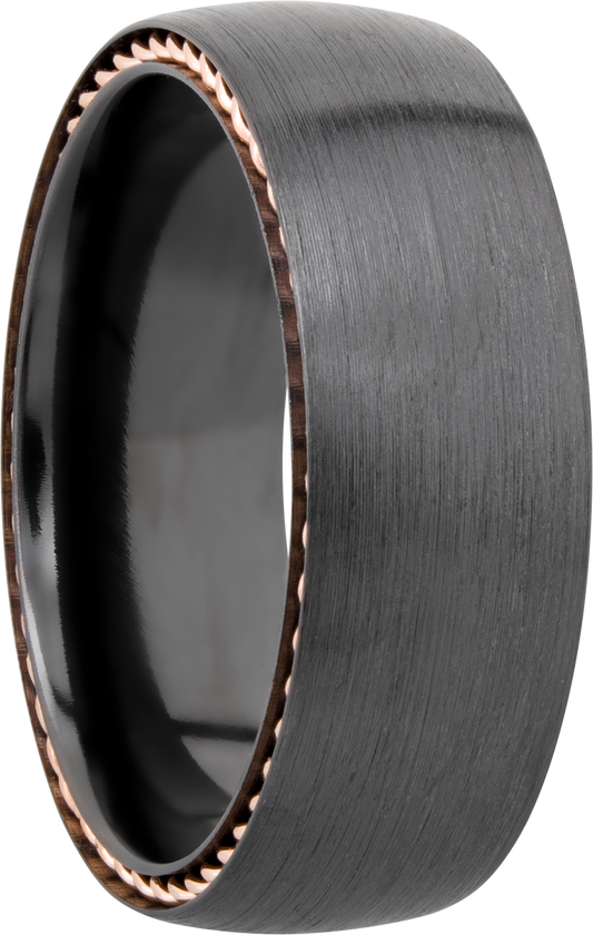 Zirconium 8mm domed band with 14K rose gold sidebraid edging