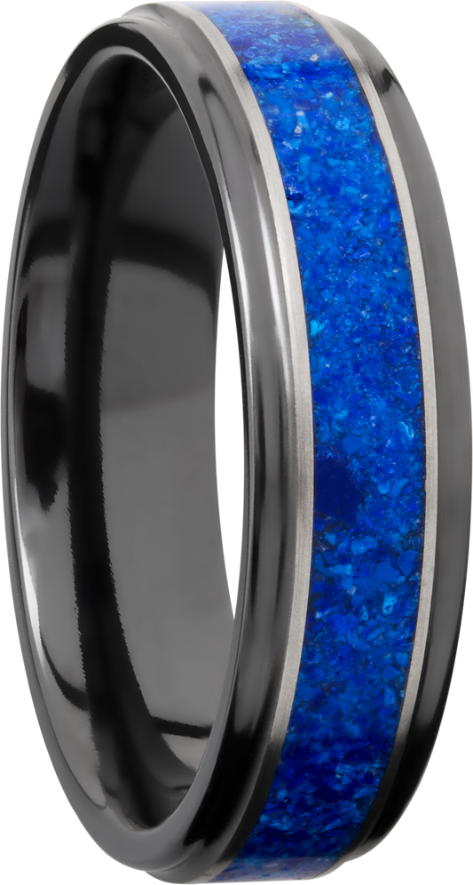 Zirconium 6mm flat band with grooved edges and a mosaic inlay of Lapis