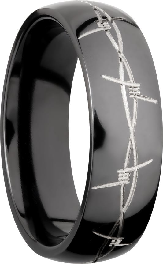Zirconium 7mm domed band with a laser-carved barbed wire pattern
